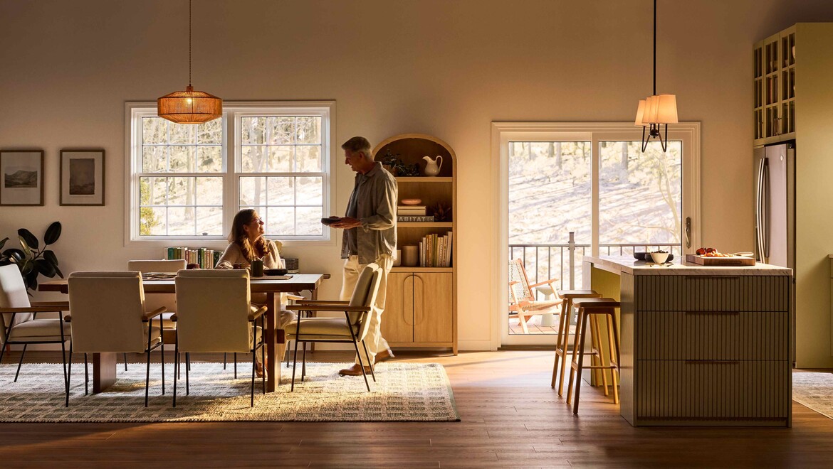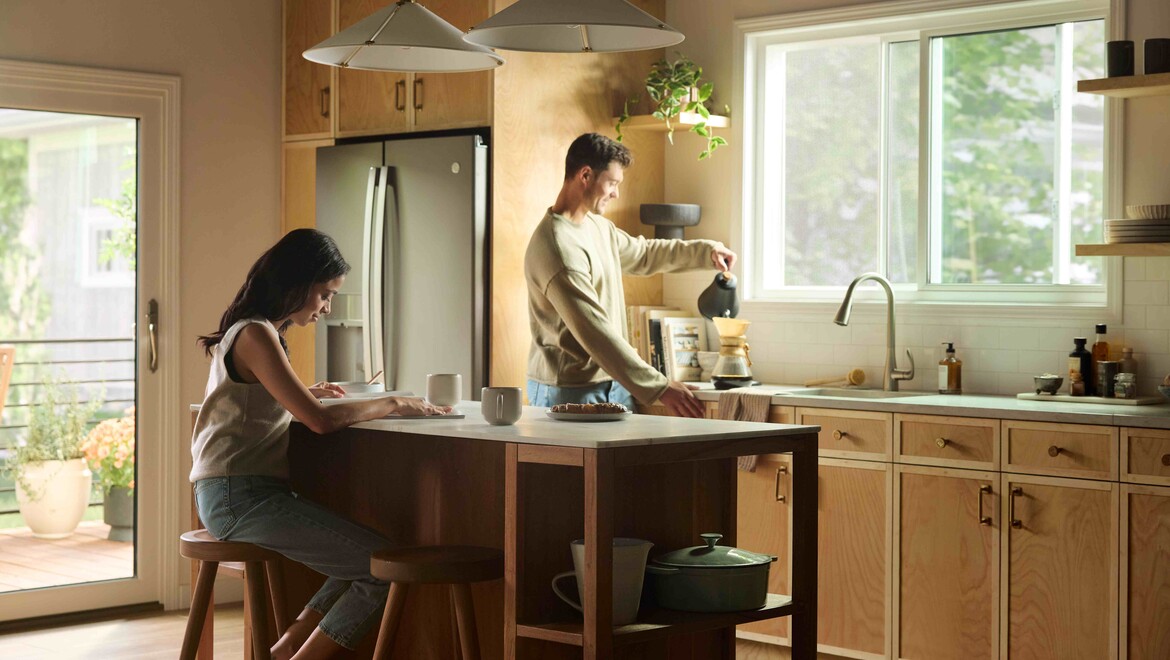 A warmly lit kitchen featuring a large Restorations Series window that frames a soft, sunlit outdoor view. A woman wearing glasses smiles as she pours coffee from a glass carafe into a mug on a marble kitchen island. A man sits across from her, partially visible, with a mug and fresh strawberries nearby. The space includes light cabinetry, a fruit basket on the counter, and gentle morning sunlight streaming through the multi-pane window.