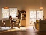 A man relaxes on a leather sofa in a softly lit living room with modern furniture, a round coffee table, and warm autumn light streaming through large windows framed by golden foliage.